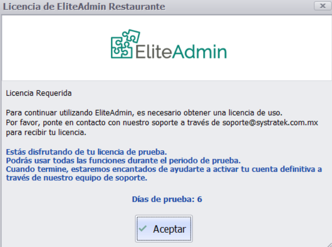 Después de guardar, el sistema mostrará un mensaje indicando que se requiere una licencia. Para continuar con el uso del sistema, Systratek debe asignarte una licencia que consiste en dos valores: