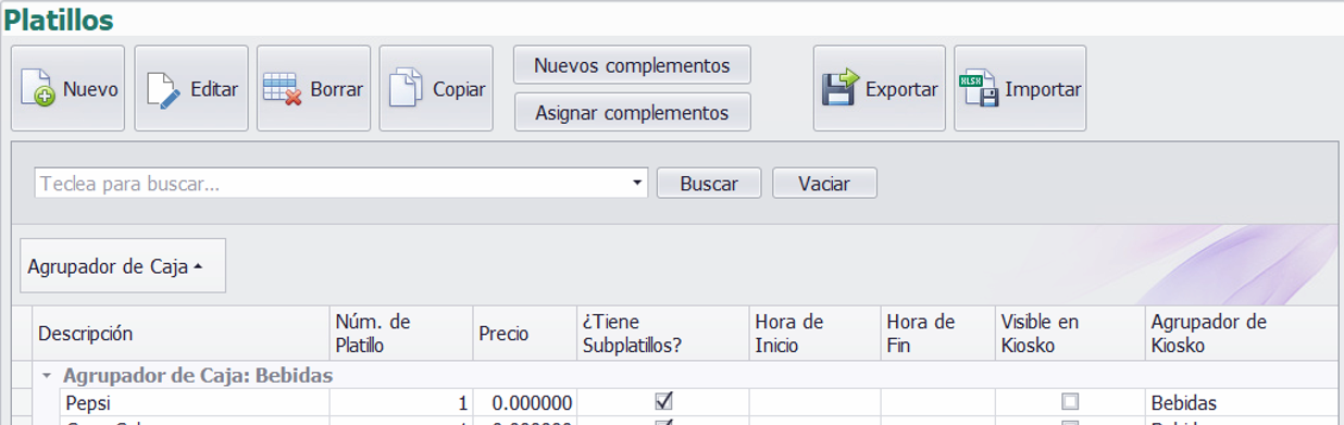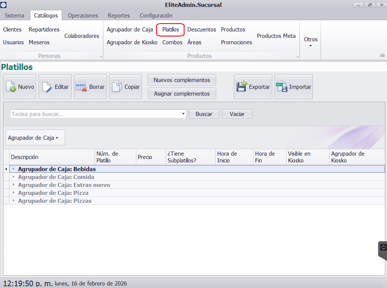 - Agrupador de caja: Define en qué pestaña de la pantalla de Cobro en Caja aparecerá el platillo.
