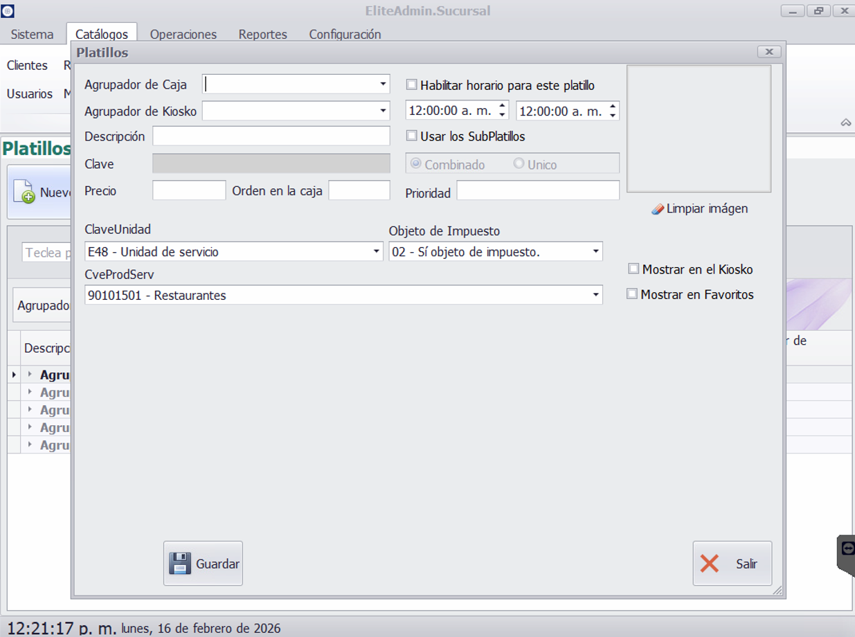 - Mostrar en kiosco: Indica si el platillo estará disponible en estaciones tipo kiosco.