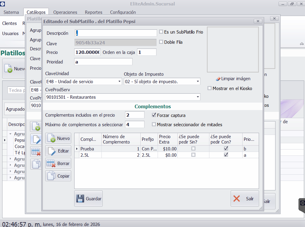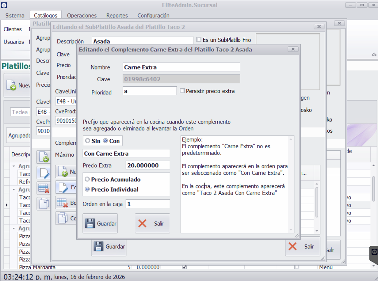 Persistir precio extra. Este campo hace que, si se tiene en el subplatillo activados los complementos incluidos en el precio (por ejemplo, 4 incluidos), si se agrega un complemento que tenga activado "Persistir precio extra", este sí se sumará al precio, a pesar de que esté dentro de la cantidad incluida.