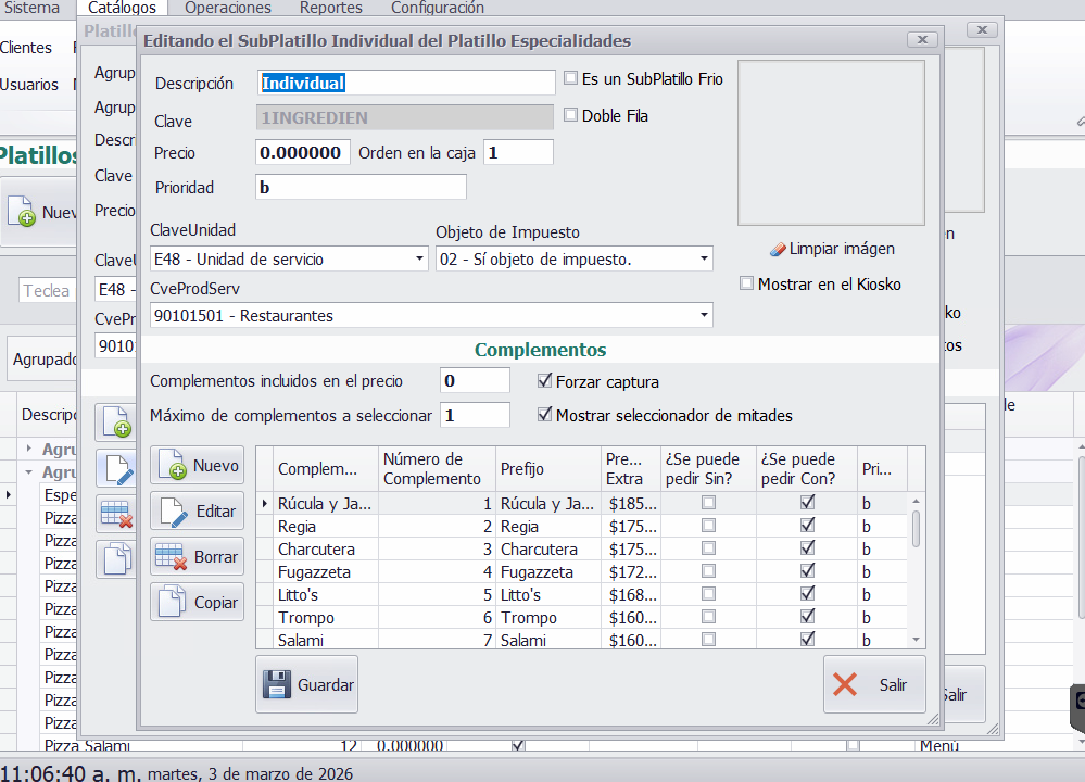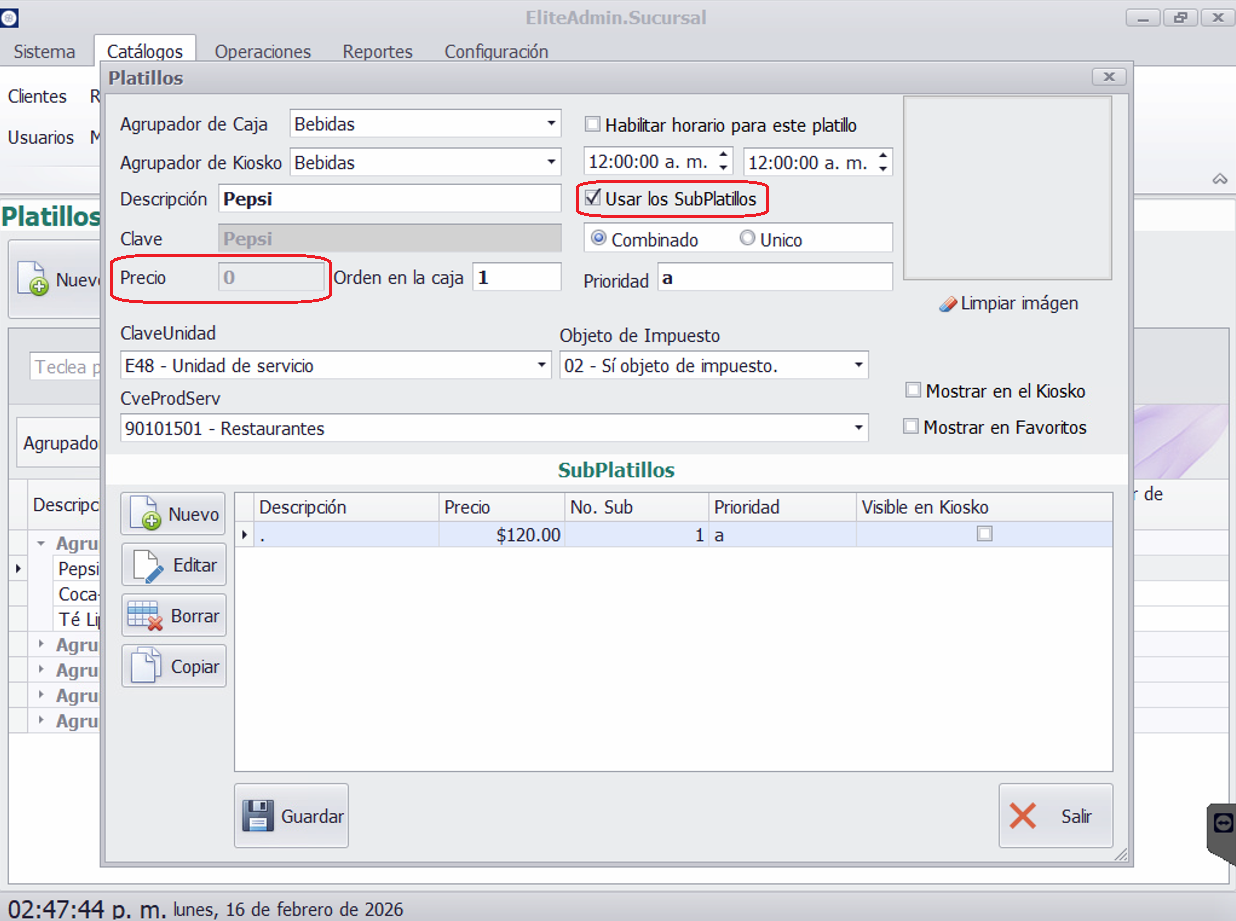 - El precio del platillo principal y subplatillo debe ser 0.