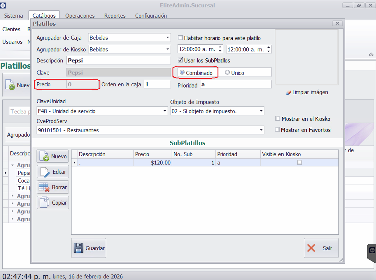 Para este ejemplo se hará uso de subplatillos mediante la opción Combinado. Es importante señalar que el precio del platillo principal no será considerado; únicamente se tomará en cuenta el precio de los subplatillos.