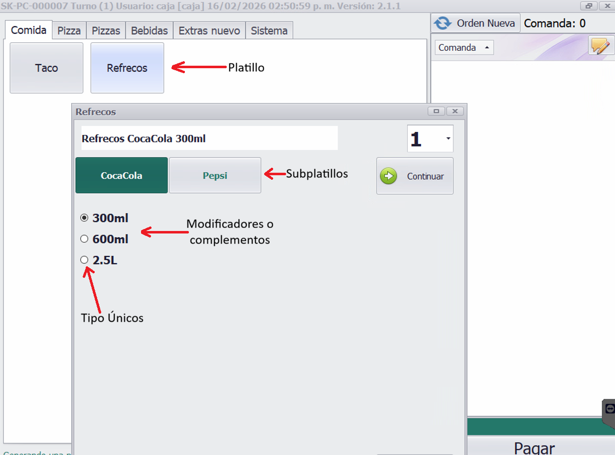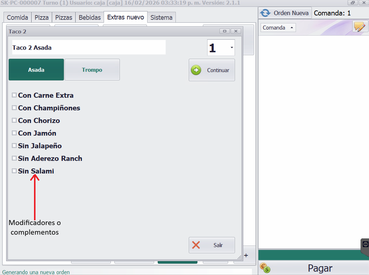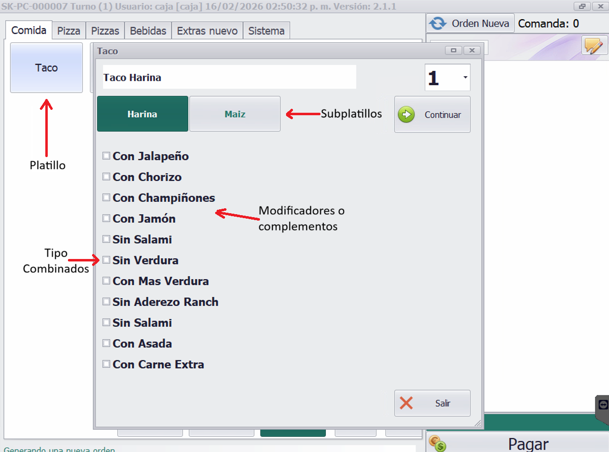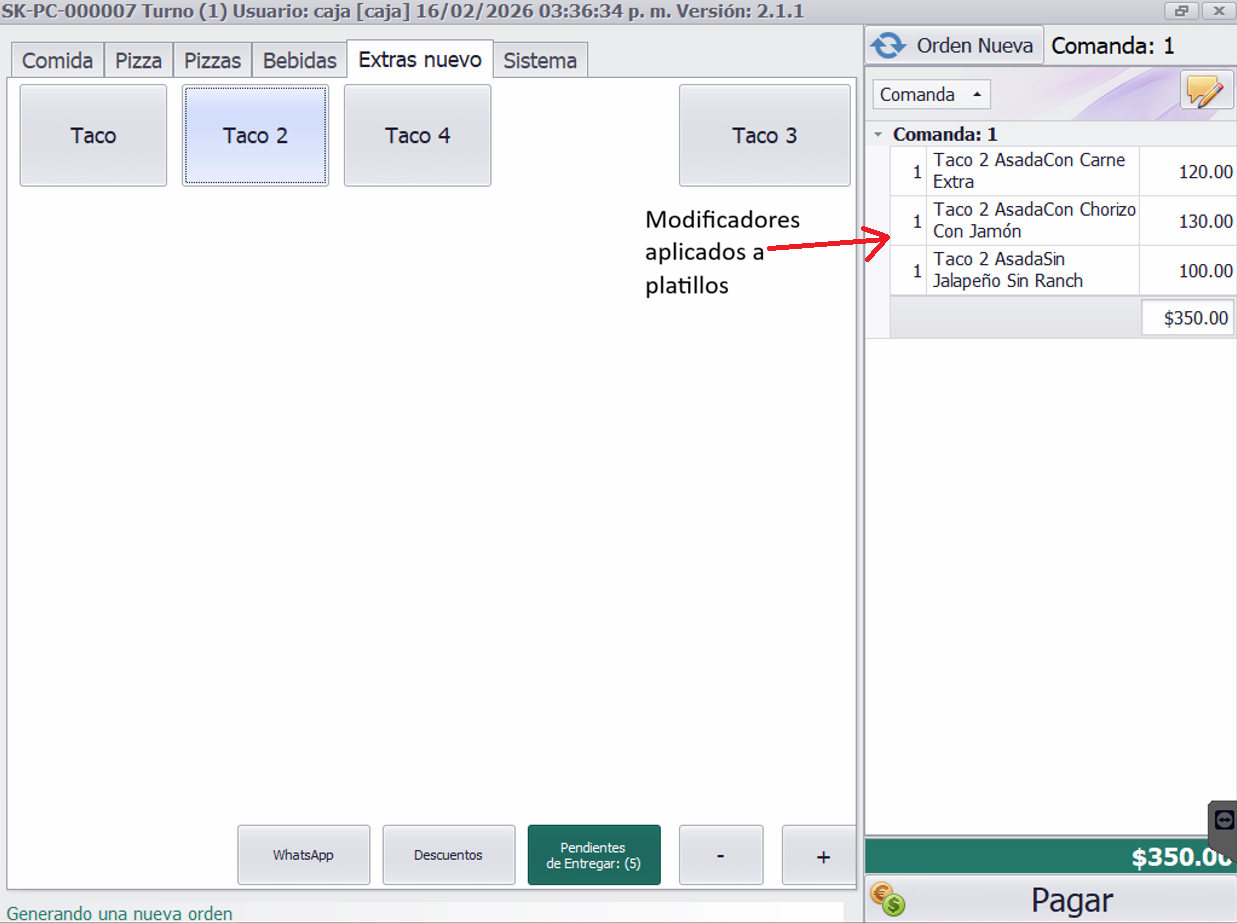 Un subplatillo combinado mostrará los complementos o modificadores disponibles asociados a dicho platillo, permitiendo seleccionar una o varios de ellos según se requiera.