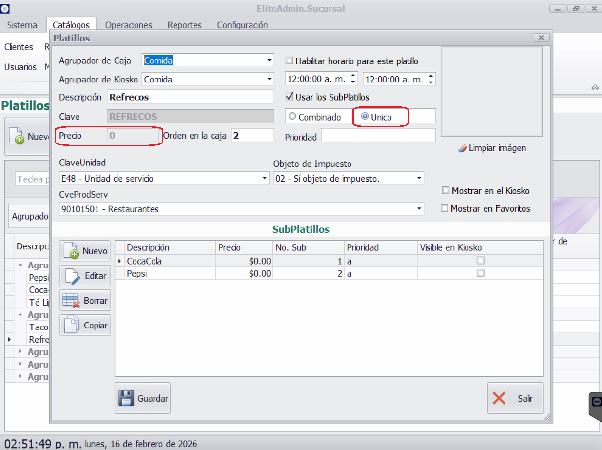 Para este ejemplo se hará uso de subplatillos mediante la opción Único. Es importante señalar que el precio del platillo principal no será considerado; únicamente se tomará en cuenta el precio de los subplatillos.