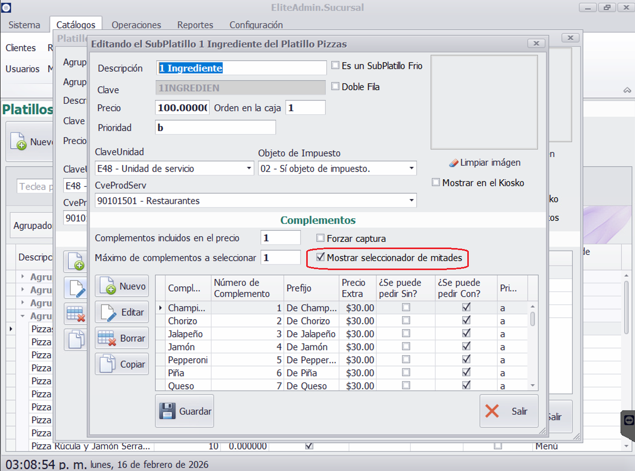 Mostrar Seleccionador de Mitades: Este campo funcionará para habilitar una vista en la pantalla del subplatillo (interfaz) para seleccionar complementos para un platillo o por mitades, por ejemplo, una pizza.