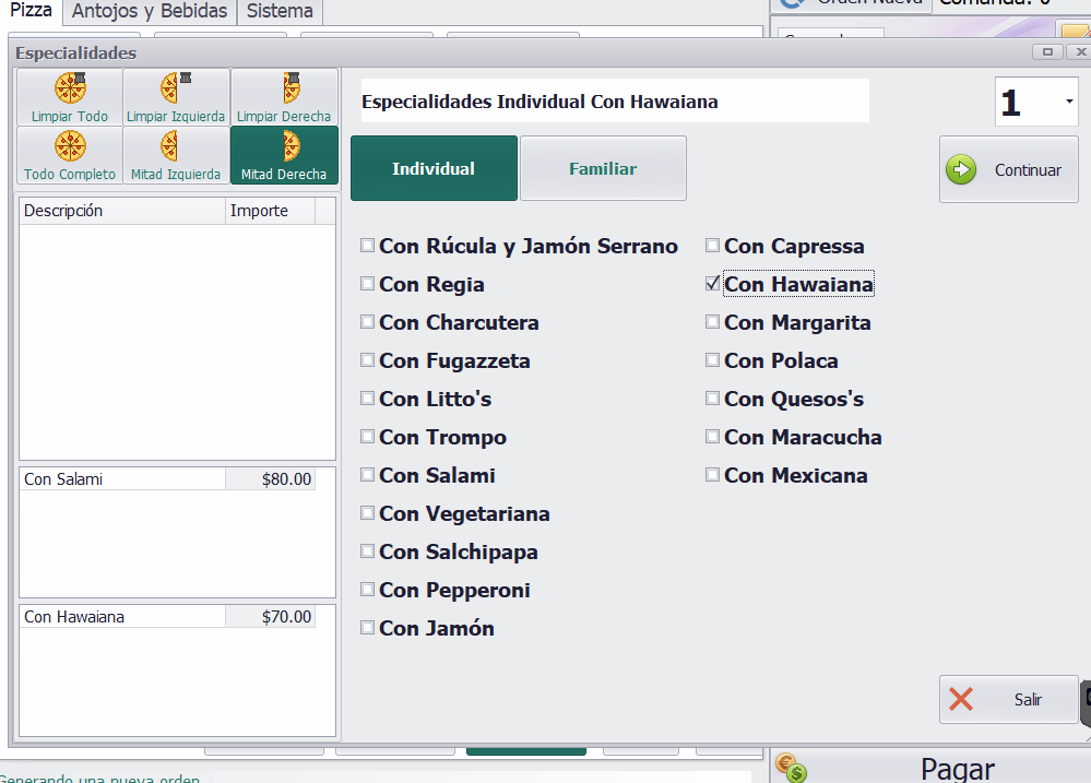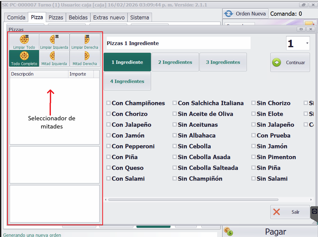- Funcionamiento: En esta parte se mostrará algo nuevo: el seleccionador de mitades. Tendrá el botón de "Todo" (para una pizza completa con ingredientes parejos) o botones de "Mitad izquierda" y "Mitad derecha".