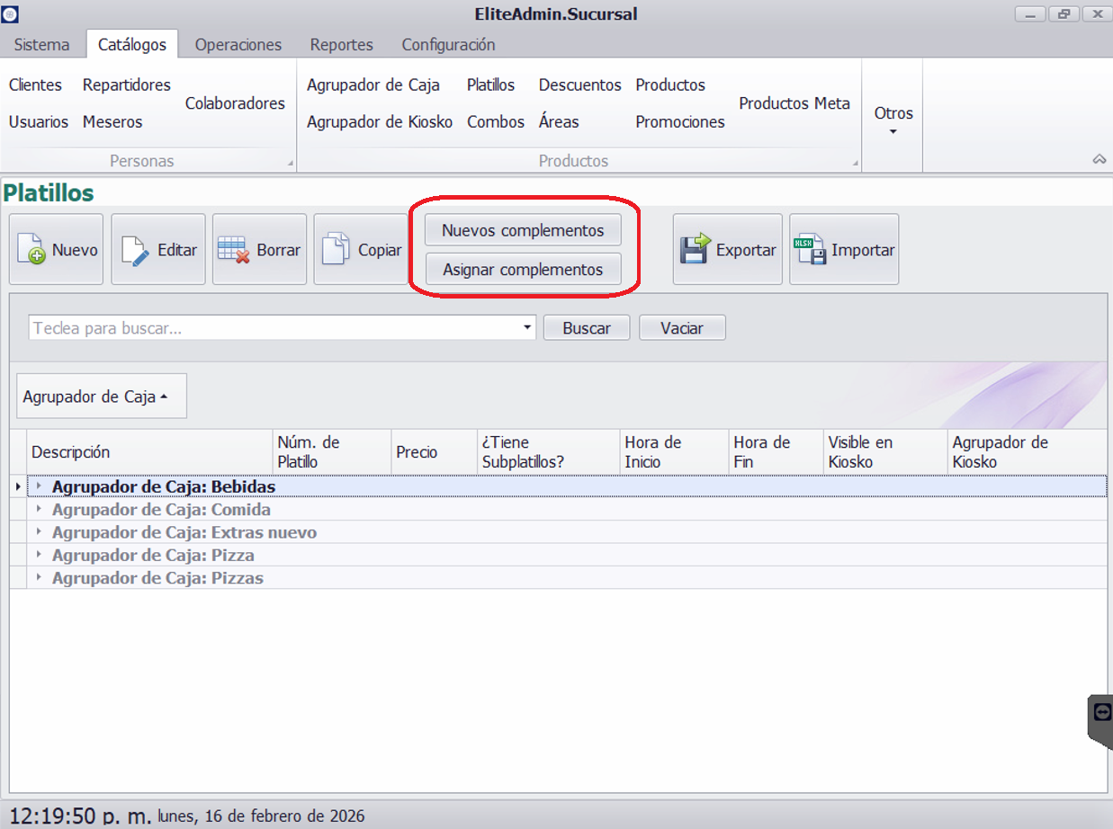 Desde el catálogo de Platillos los complementos tienen 2 botones para crearlos y signarlos: Nuevo Complemento y Asignar Complementos.