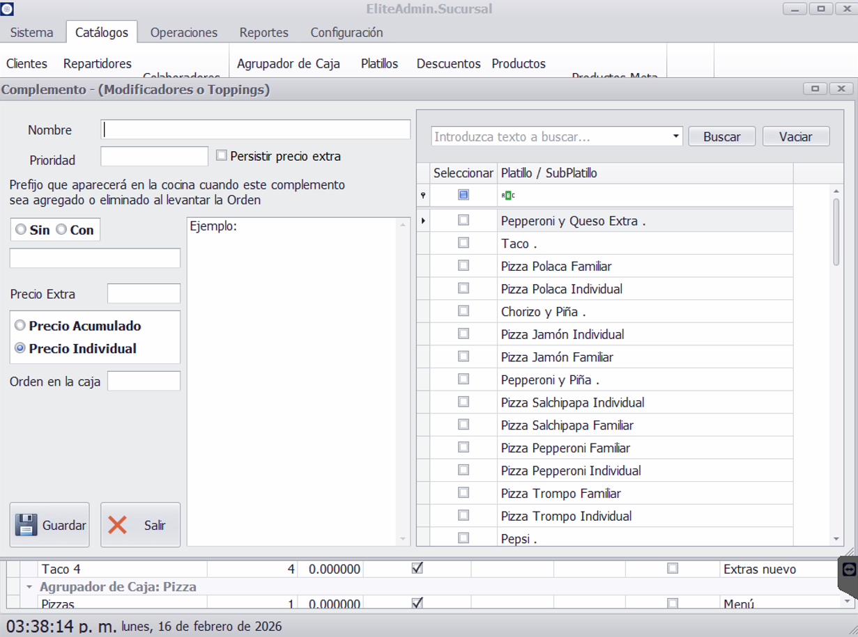 - En el botón Nuevo Complemento se podrá poner la misma información que tienen los complementos en los subplatillos (nombre, prioridad, prefijo, precio extra, tipo de precio). Del lado derecho se tendrá una lista con todos los platillos y subplatillos del tipo combinado. Esto permite crear un complemento y agregárselo directamente a algún platillo que se desee sin tener que ir hasta el platillo específico.
