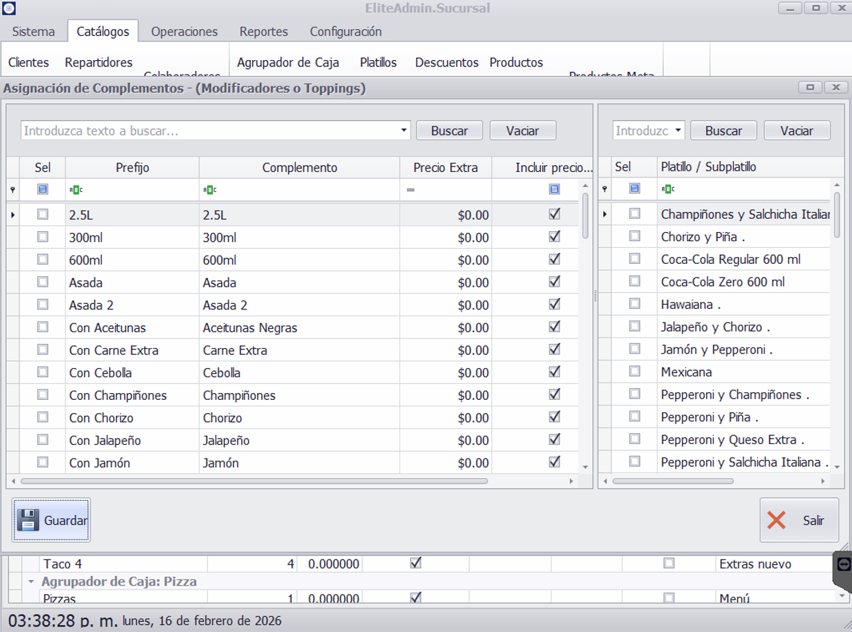 - En el botón Asignación de Complementos una vez creados tus complementos, usa este botón para agregarlos rápidamente a tus platillos existentes. Esta herramienta es ideal para aplicar el mismo grupo de opciones (ej. "Tipos de leche") a múltiples productos (ej. todos los cafés) en un solo paso. Del lado izquierdo aparecen los complementos o modificadores que se pueden agregar y del lado derecho se tendrá una lista con todos los platillos y subplatillos del tipo combinado.
