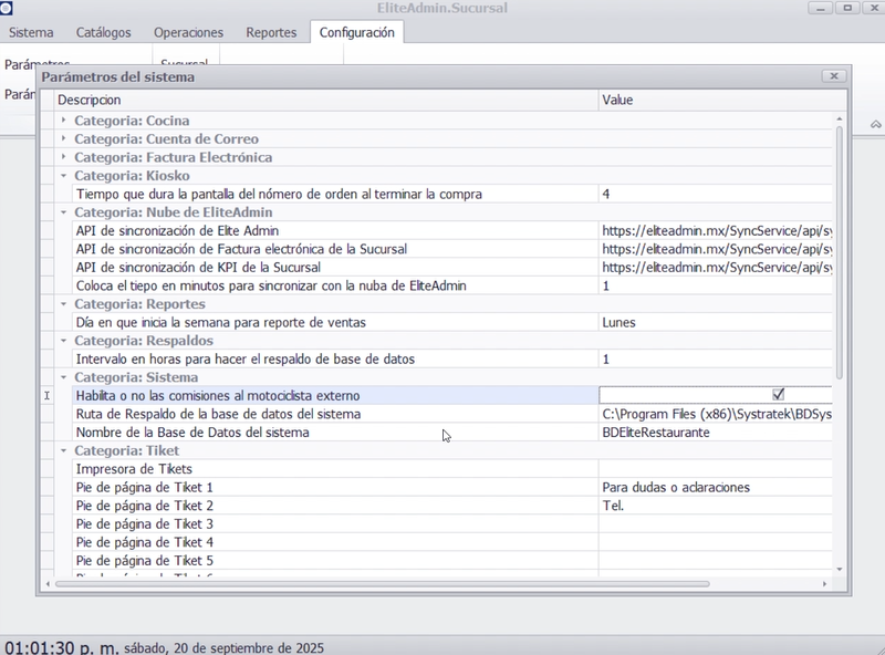 Configuración → Parámetros → Categoria: Sistema → Habilitar comisiones de motociclista externo.
