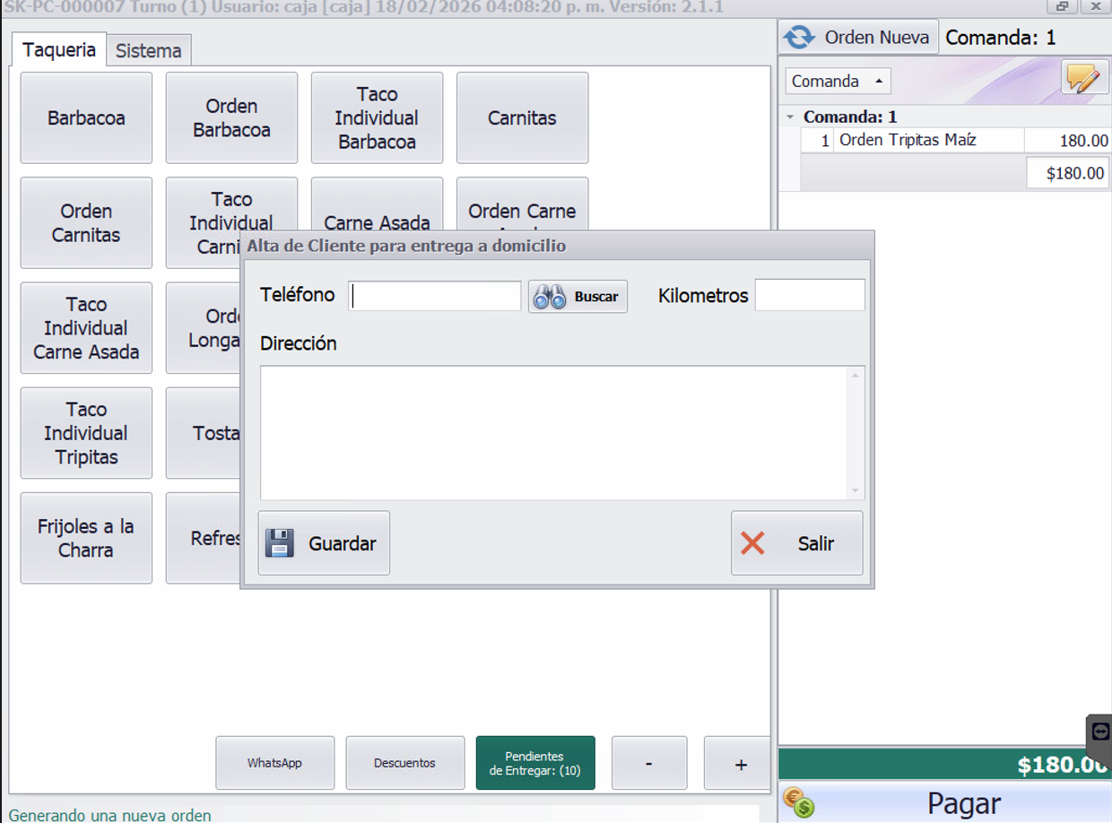 - Registrar kilómetros: Capture la cantidad de kilómetros desde la sucursal hasta el domicilio del cliente. Este dato es indispensable para que el sistema calcule automáticamente la comisión del repartidor.