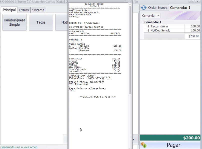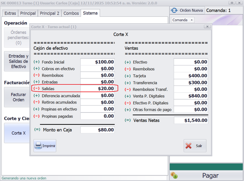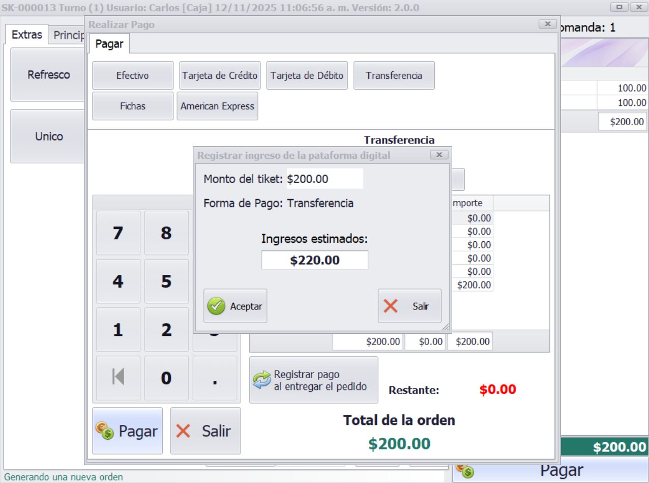 - El sistema registra $220 como ingreso en reportes y cortes, aunque el ticket conserve el total original de $200.