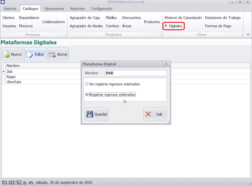 Para habilitar esta opción, ingresa a: Catálogos → Plataformas digitales, edita la plataforma y selecciona Registrar ingresos estimados.