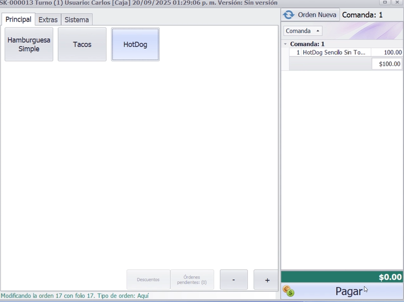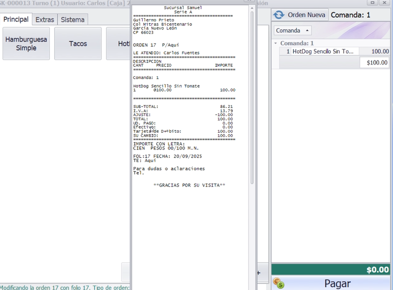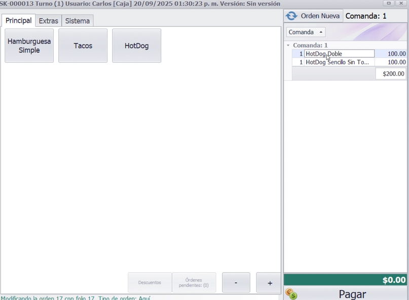 Se modifica la orden 17, se eliminara de la orden el Hotdog Doble.