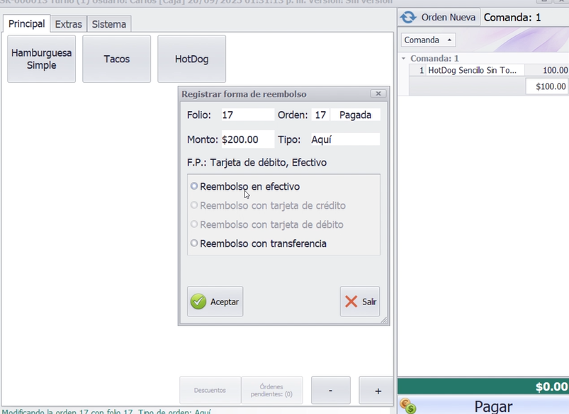 Se debe elegir un método de reembolso si se modifica una orden en donde se le reste un platillo.