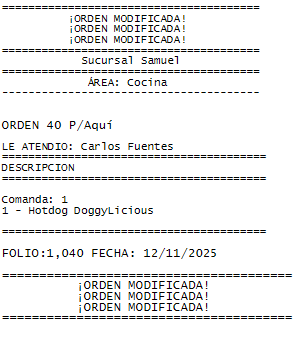 Modificada la orden, se notifica al área que prepara el platillo que esa orden fue modificada de la siguiente forma: