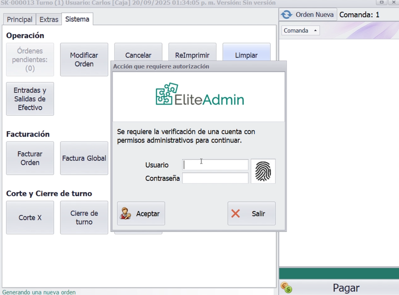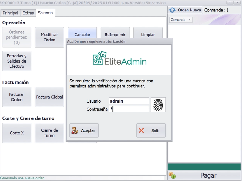Este manual explica las funciones administrativas disponibles en la pantalla de Cobro en Caja para la gestión de órdenes y movimientos de efectivo. Estas opciones requieren permisos de administrador ya que impactan en los registros financieros.