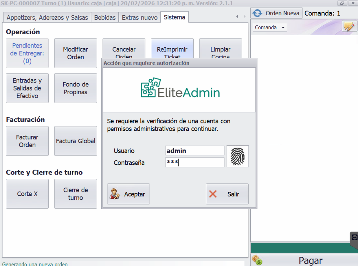 El botón Reimprimir Tickets permite volver a imprimir tickets de órdenes ya registradas. Para acceder a esta función se requiere usuario con permisos de administrador.