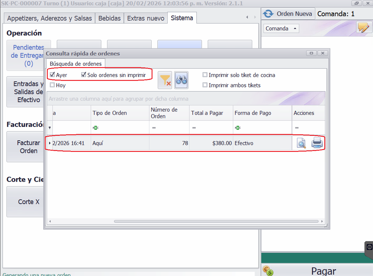 - Solo órdenes sin imprimir: Muestra únicamente las órdenes cuyo ticket no se haya impreso al momento de registrarlas.