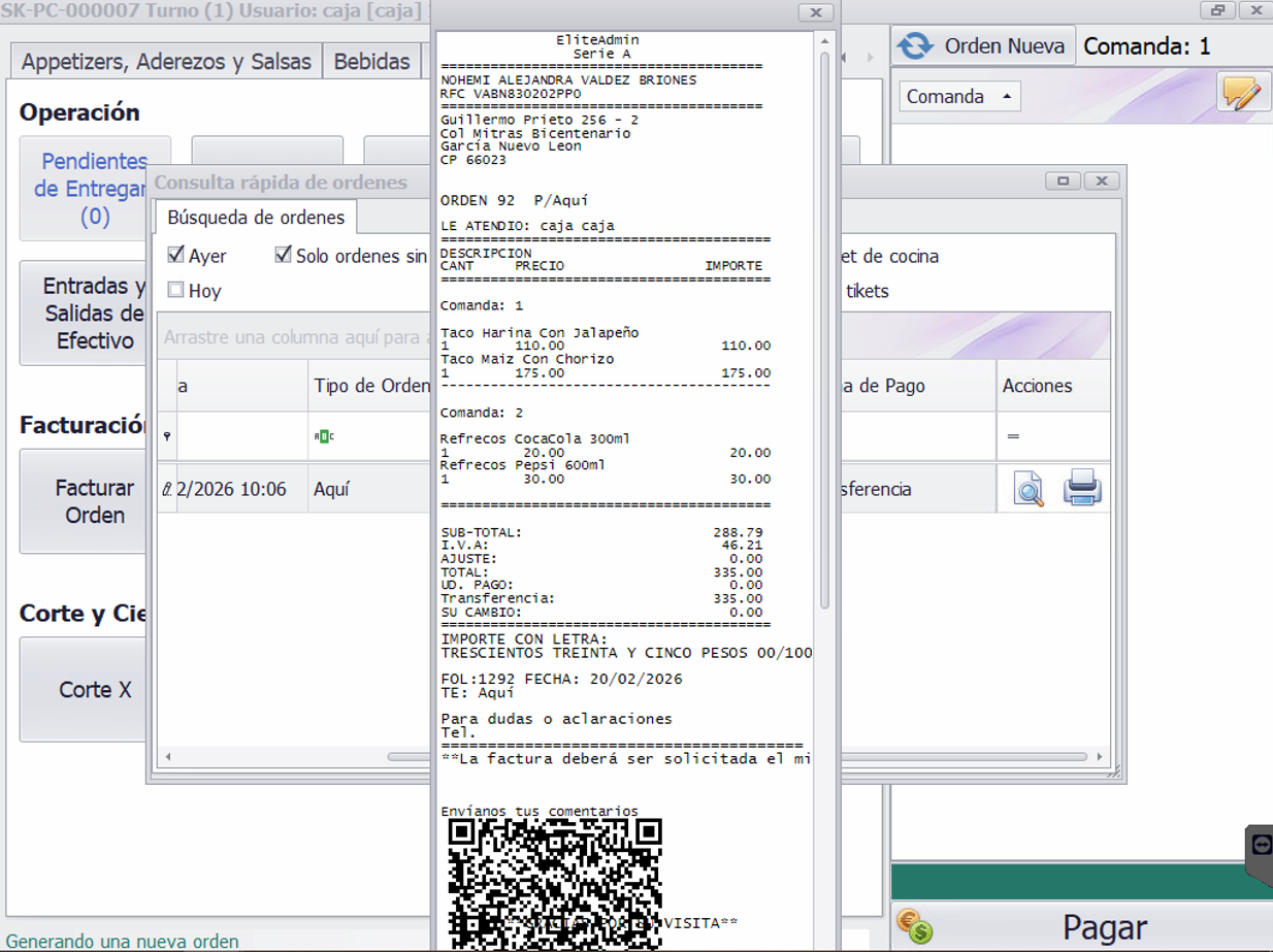 - Detalle de la orden: Muestra la información completa de la orden, incluyendo folio, número, tipo, monto total, referencia y comandas.