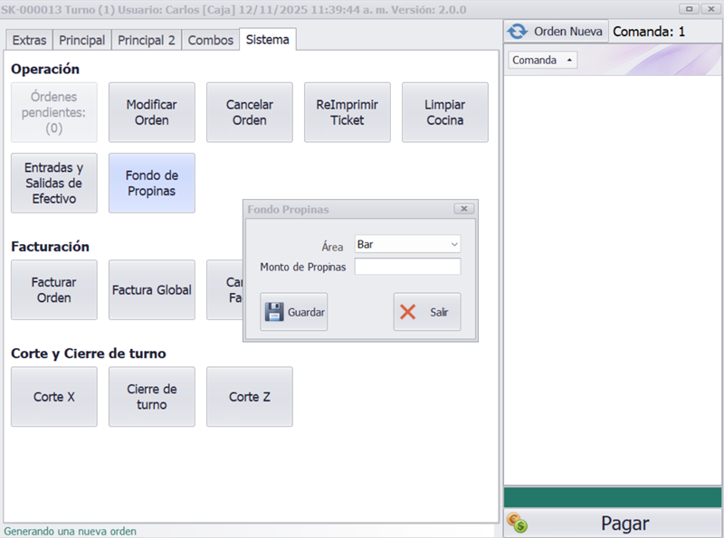 - Fondo de Propinas: mantiene el control de propinas de área con fondo de propinas.