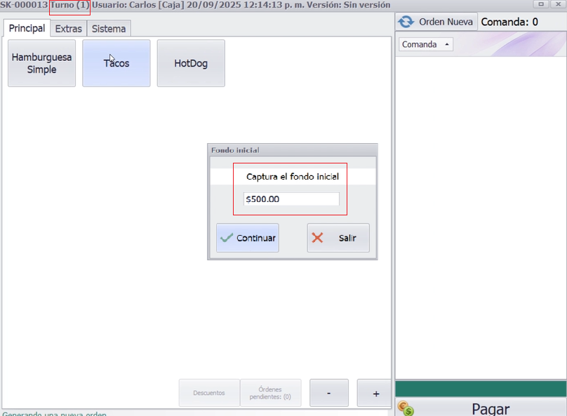Al iniciar un nuevo turno, el sistema ya no solicita un fondo inicial, sino que trabaja con el fondo de caja. Este valor corresponde al dinero con el que realmente comenzará la operación del turno.