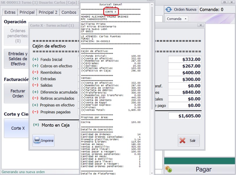 El Corte X es un reporte informativo que muestra el estado de la caja en cualquier momento del turno. Incluye: