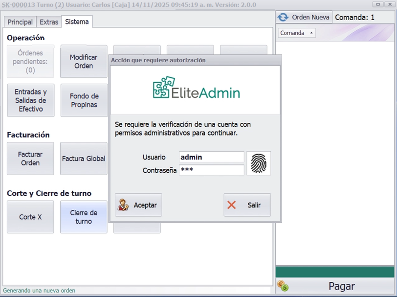 Al finalizar un turno, el sistema solicita permisos administrativos para continuar: