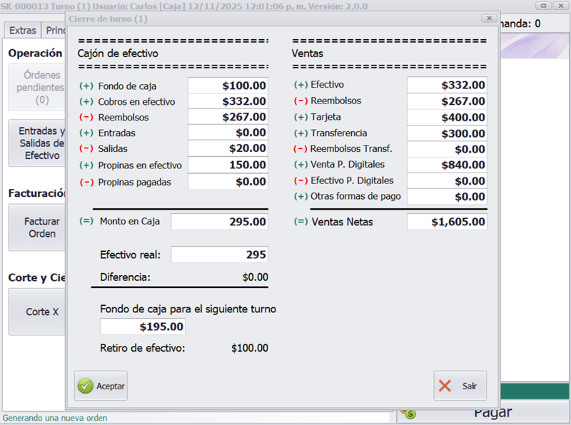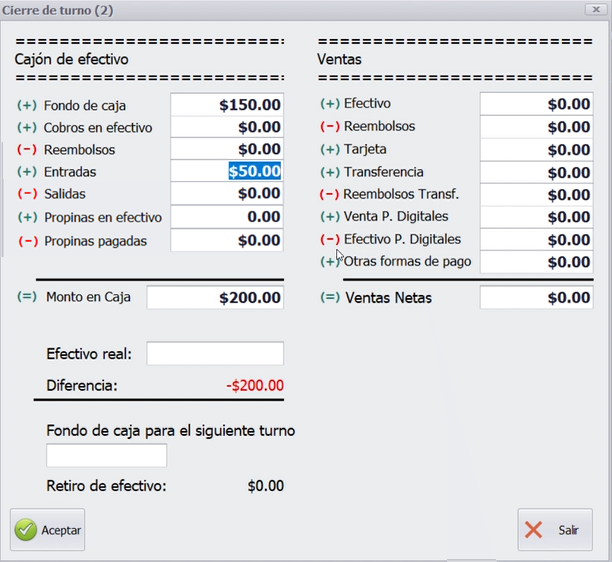 - Incluye ventas, propinas, fondos de propina, entradas, salidas, retiros, diferencias y descuentos.