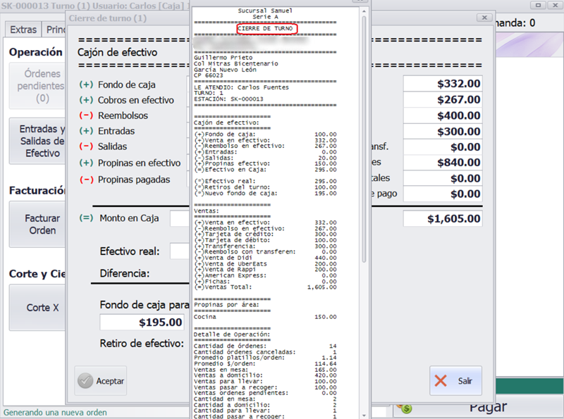 Al momento de realizar el cierre de turno, estos datos se consolidan en el ticket correspondiente, mostrando claramente el fondo de caja inicial del turno, las diferencias detectadas y el monto final con el que se continuará la operación o se iniciará el siguiente turno.