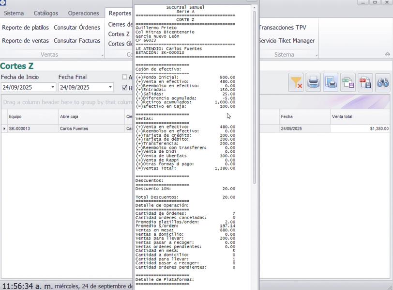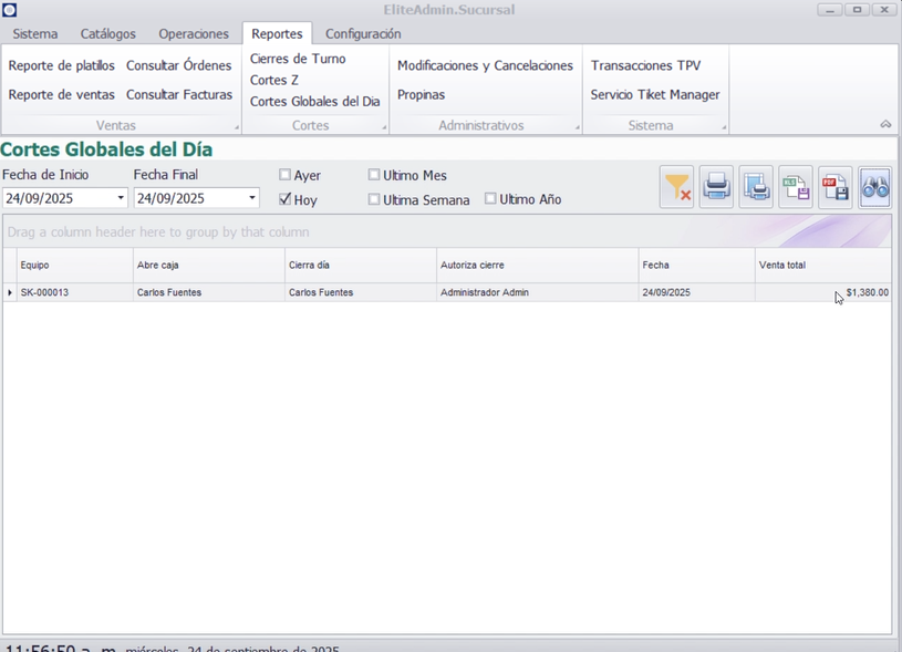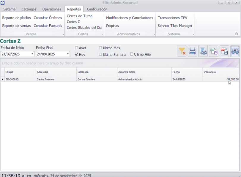 Este manual proporciona una guía rápida y estructurada para utilizar el apartado de Reportes del sistema, mostrando cómo consultar cierres de turno, cortes Z y cortes globales del día, así como generar sus impresiones correspondientes. Desde aquí puedes: