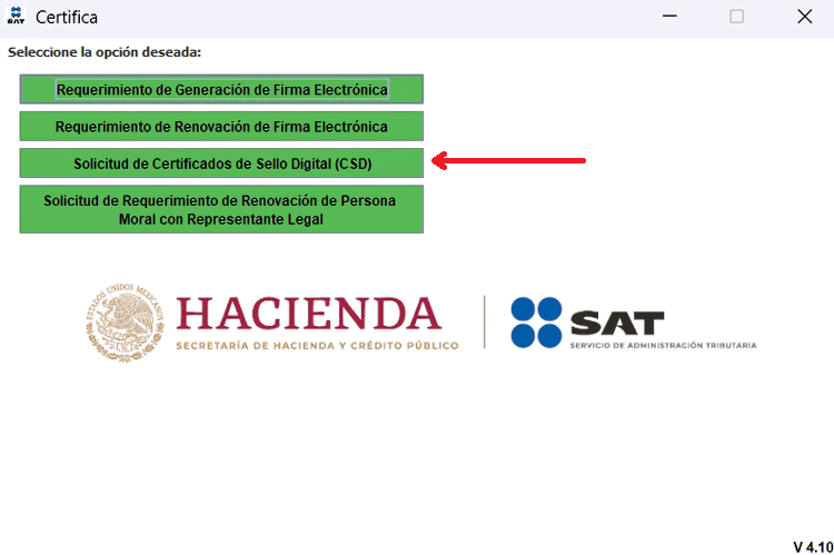 - Seleccionar la opción Solicitud de Certificado de Sello Digital.