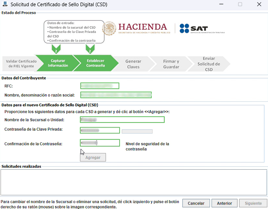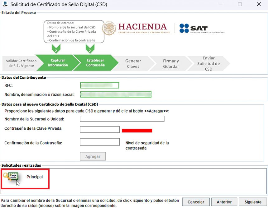 - Ingresar una referencia de sucursal (opcional) y definir una contraseña para la llave privada.