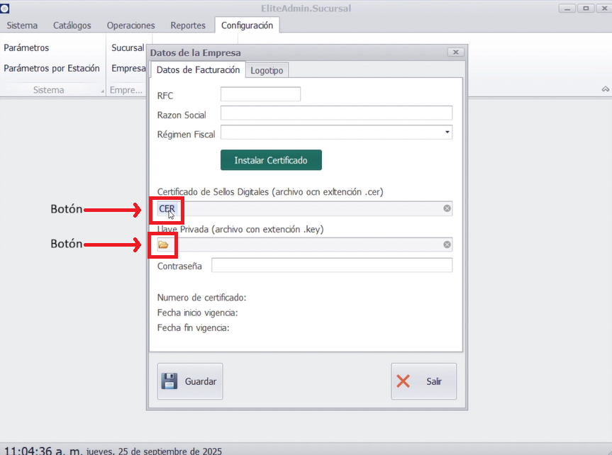 .key(llave privada). - Introduce la contraseña asociada al certificado.