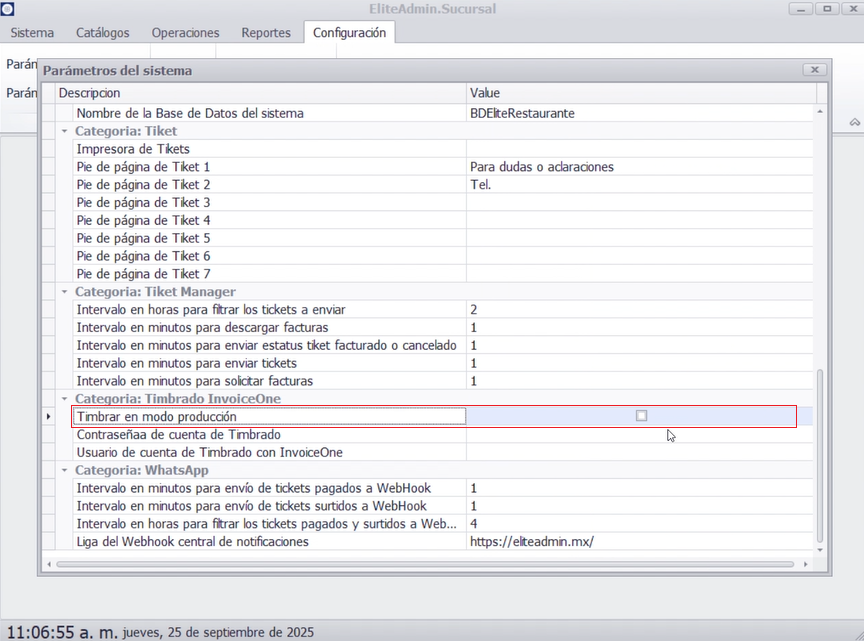- Activa o desactiva la opción Timbrar en producción. Desactivada estará en modo pruebas.