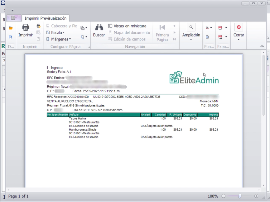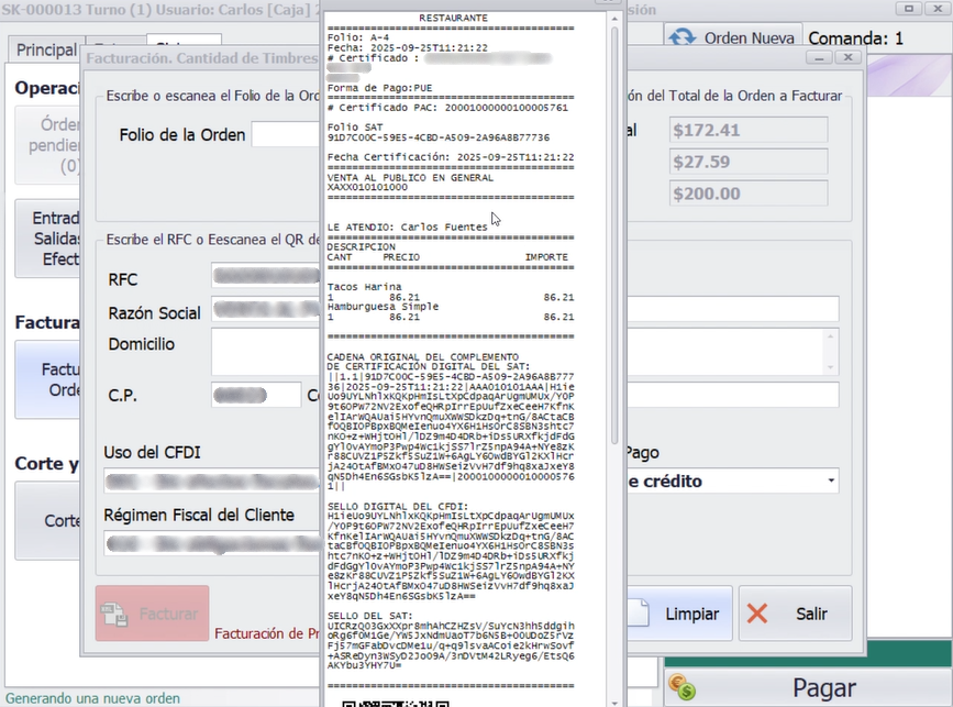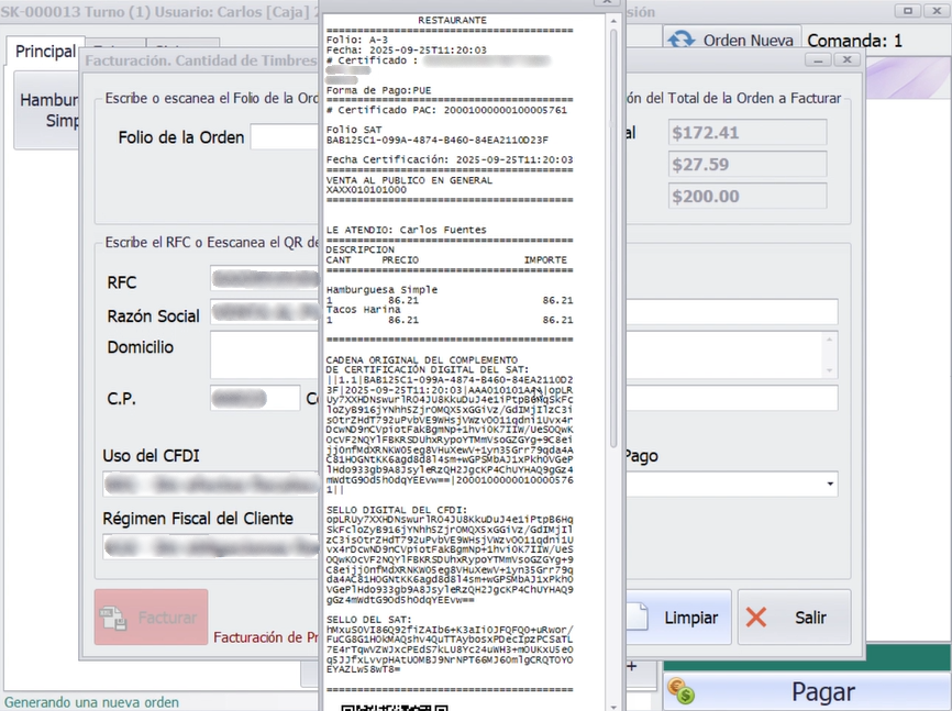 - Haz clic en Facturar. Se generará la factura electrónica con su sello y representación impresa.