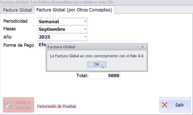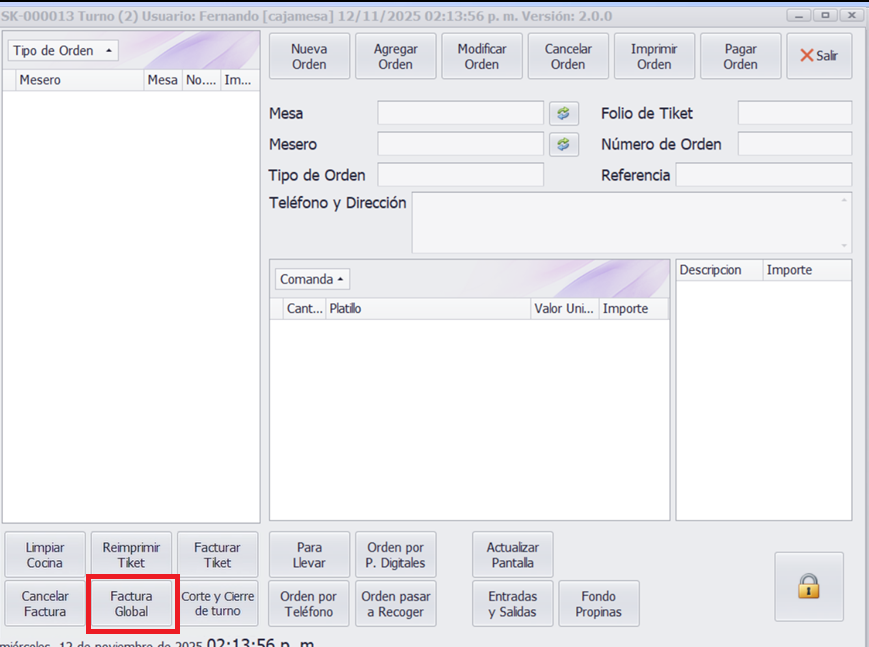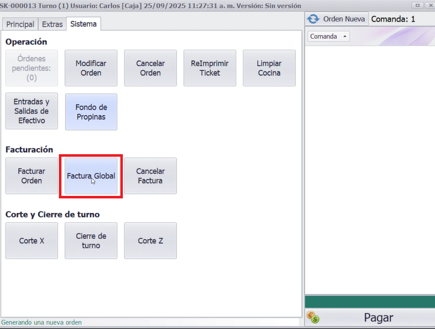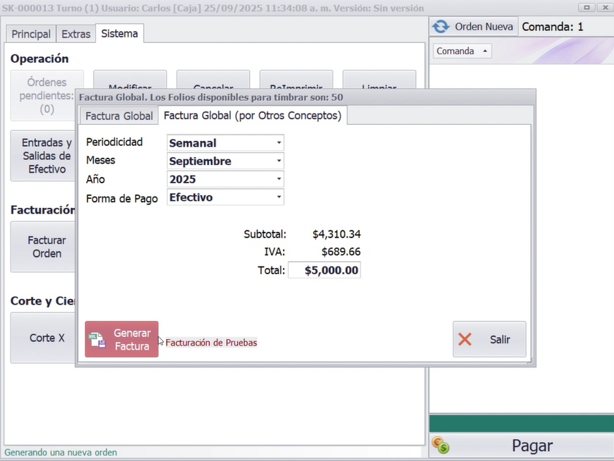 En caso de que existan órdenes registradas fuera del sistema, se puede generar una Factura Global Manual. Para ello el usuario debe capturar:
