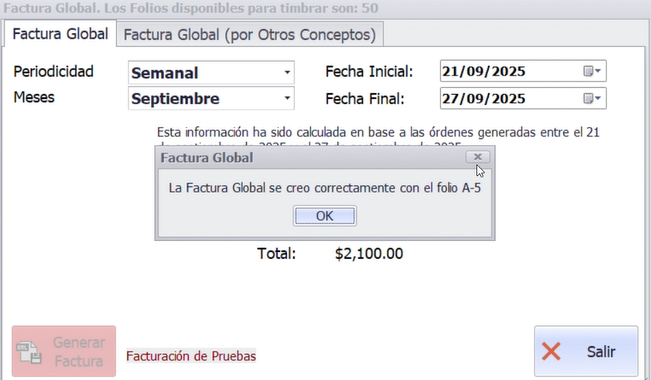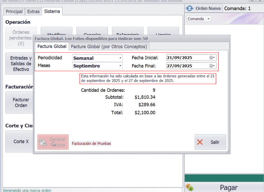 Al confirmar, el sistema toma cada orden no facturada como una partida dentro de la factura. Todas las órdenes se incluyen como conceptos hasta consolidar el total.