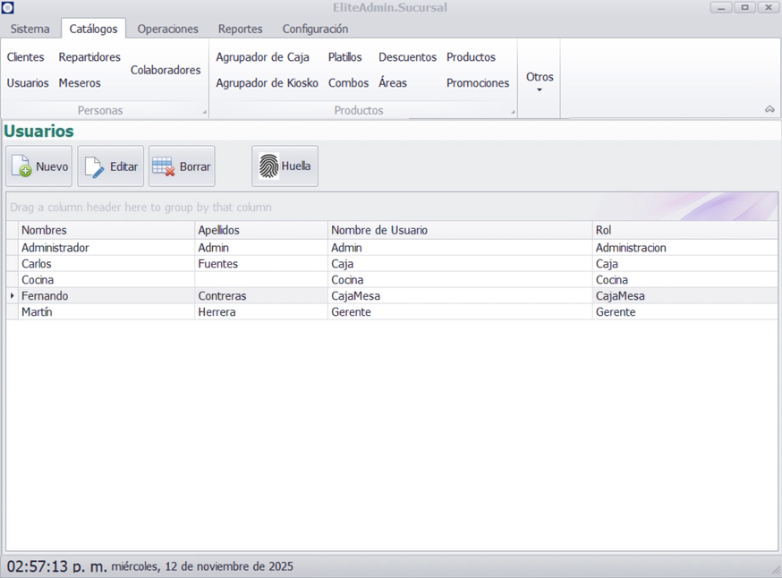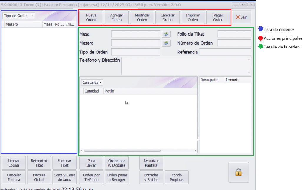 Al iniciar sesión con un usuario de rol Caja Mesa, la pantalla mostrará un menú centralizado con todas las órdenes activas agrupadas por su tipo (para comer aquí, para llevar, por teléfono, plataformas digitales, pasar a recoger). Para poder operar esta pantalla, el usuario correspondiente a Servicio de Mesas debe haber sido previamente registrado en el sistema.