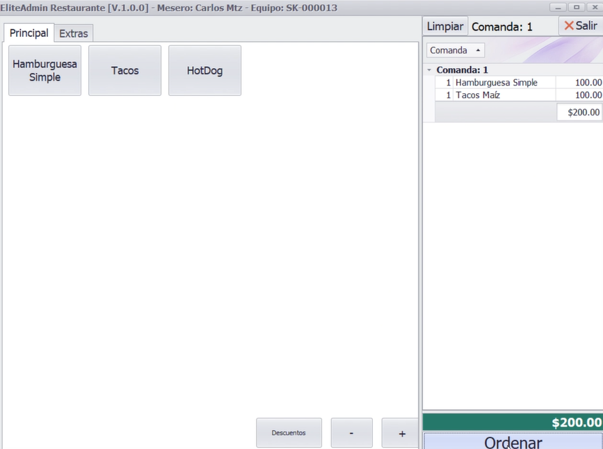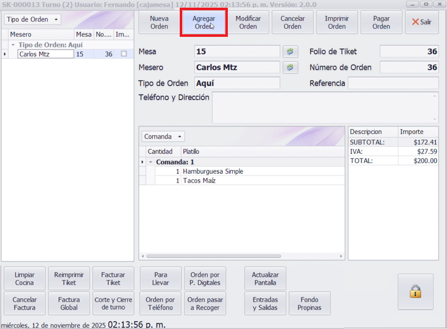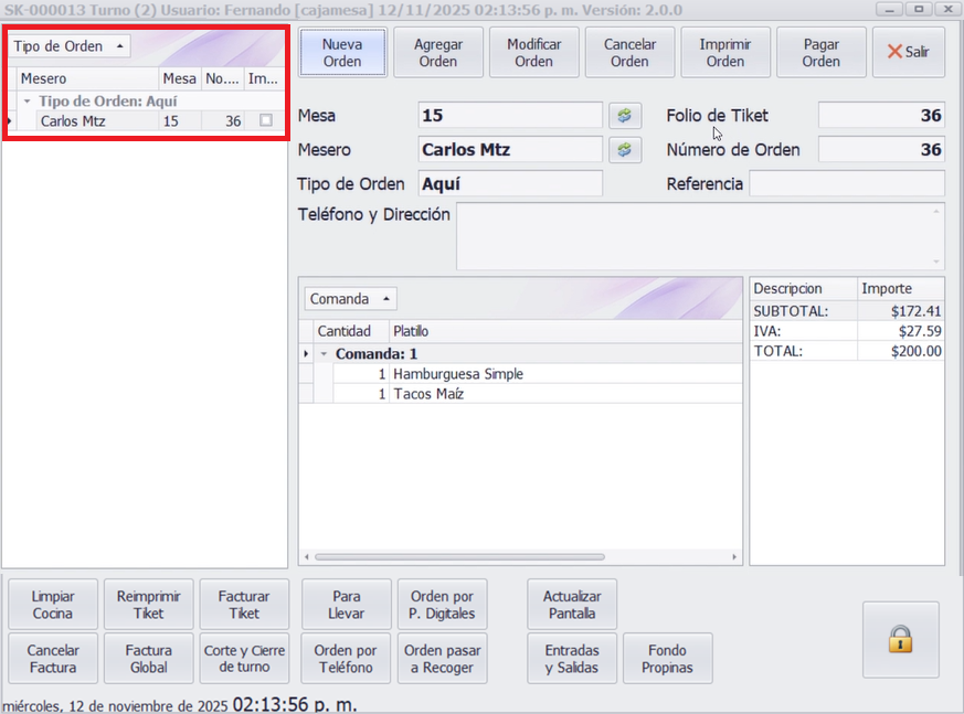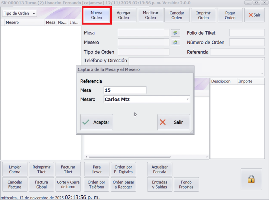 - Nombre del mesero: Debe estar registrado previamente.