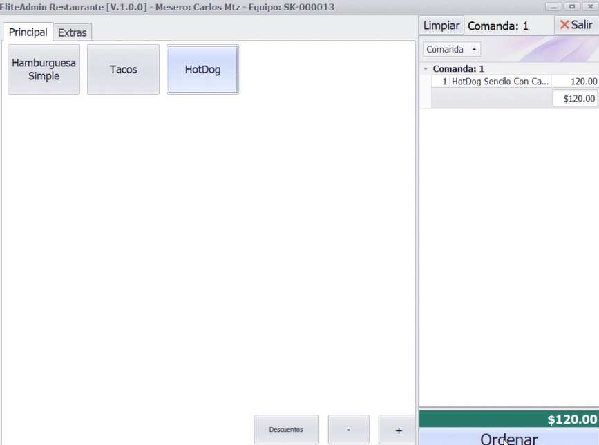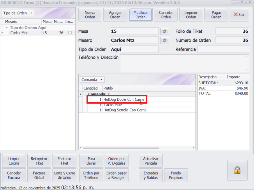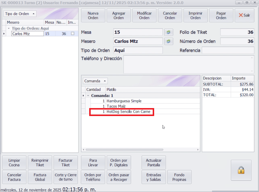 Seleccione la orden en curso y haga clic en Agregar Orden. Registre los nuevos platillos, por ejemplo, un hot dog con carne. El sistema actualizará los detalles de la orden y los importes.