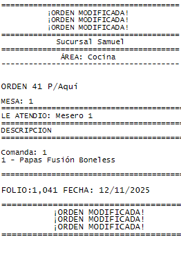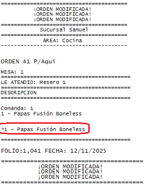 Despues de modificar la orden, se notifica al área que prepara el platillo que esa orden fue modificada como en el siguiente ejemplo: