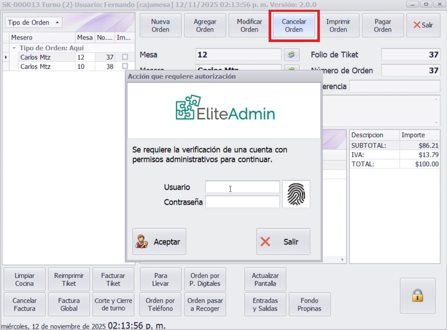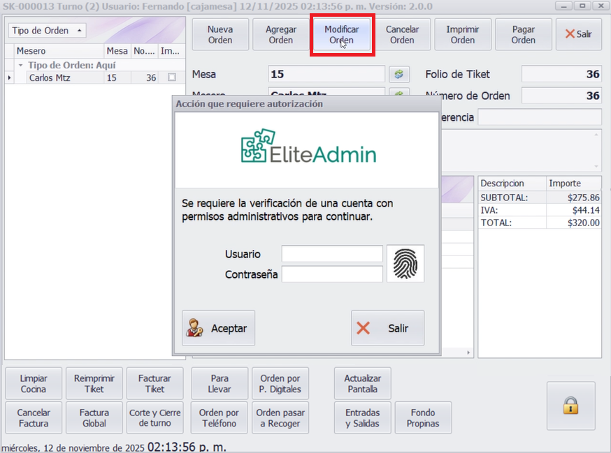 Para cambiar o sustituir platillos, seleccione la orden y elija la opción Modificar Orden. El sistema pedirá usuario y contraseña de administrador, ya que se afectan montos.