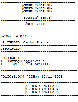 Despues de cancelar la orden, se notifica al área que prepara el platillo que esa orden fue cancelada como en el siguiente ejemplo: