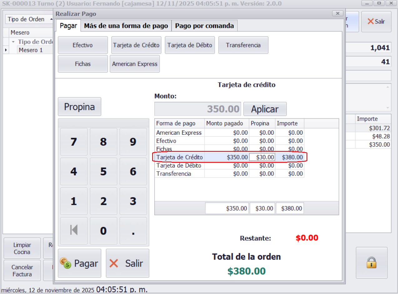 Ademas de poder agregar propina por la forma de pago que se eligio como en el siguiente ejemplo: