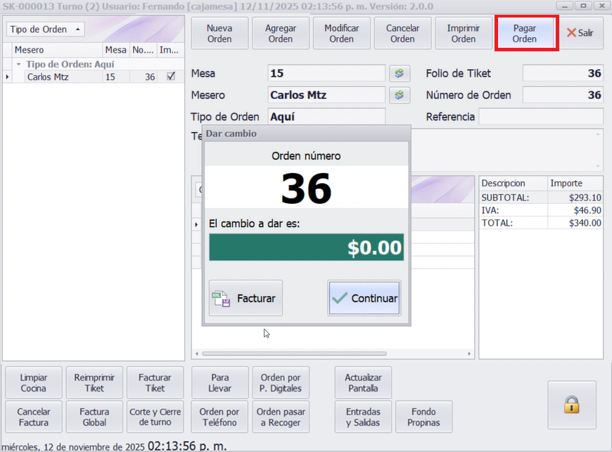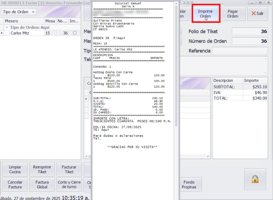 Cuando el cliente pida la cuenta, seleccione la orden y haga clic en Imprimir Orden. El ticket debe entregarse al cliente para su pago.
