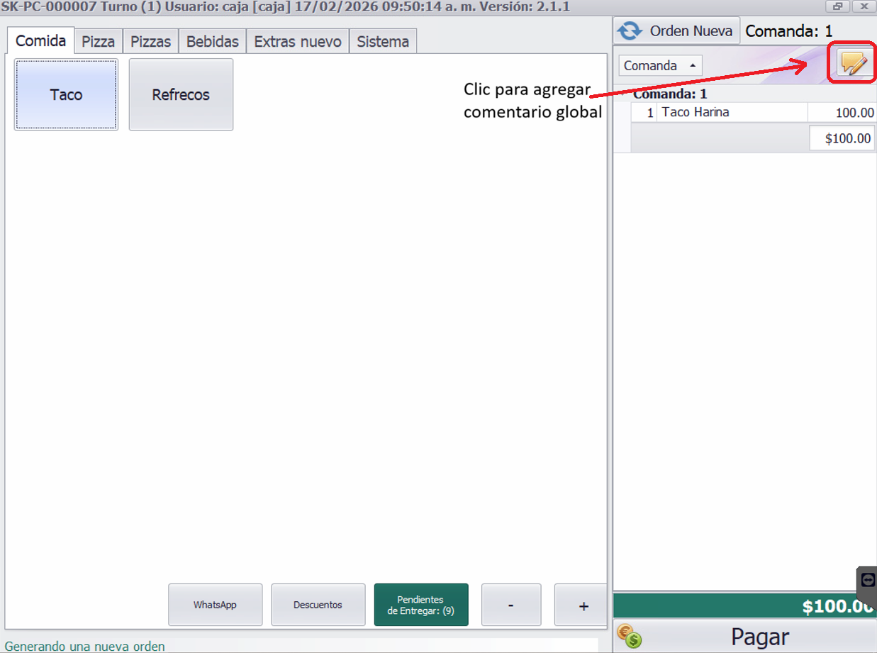 A diferencia de los comentarios por platillo, los Comentarios Globales permiten agregar una nota general que aplica a toda la orden (por ejemplo, "Todo sin cebolla" o "Empacar todo aparte").