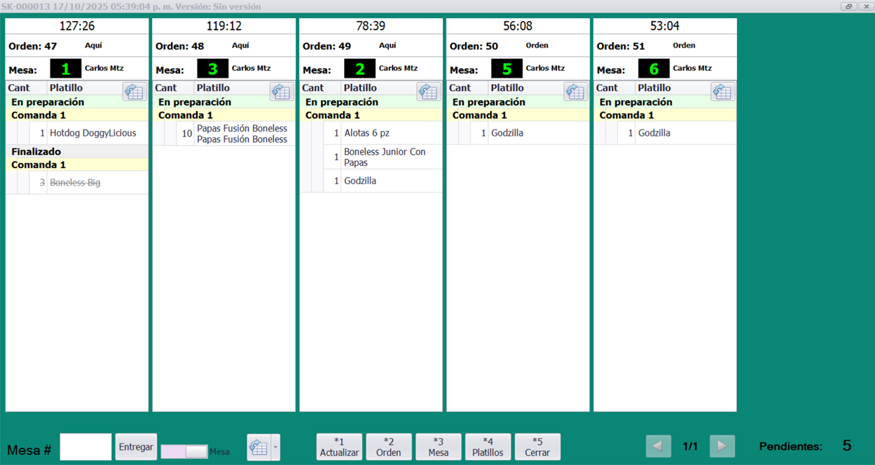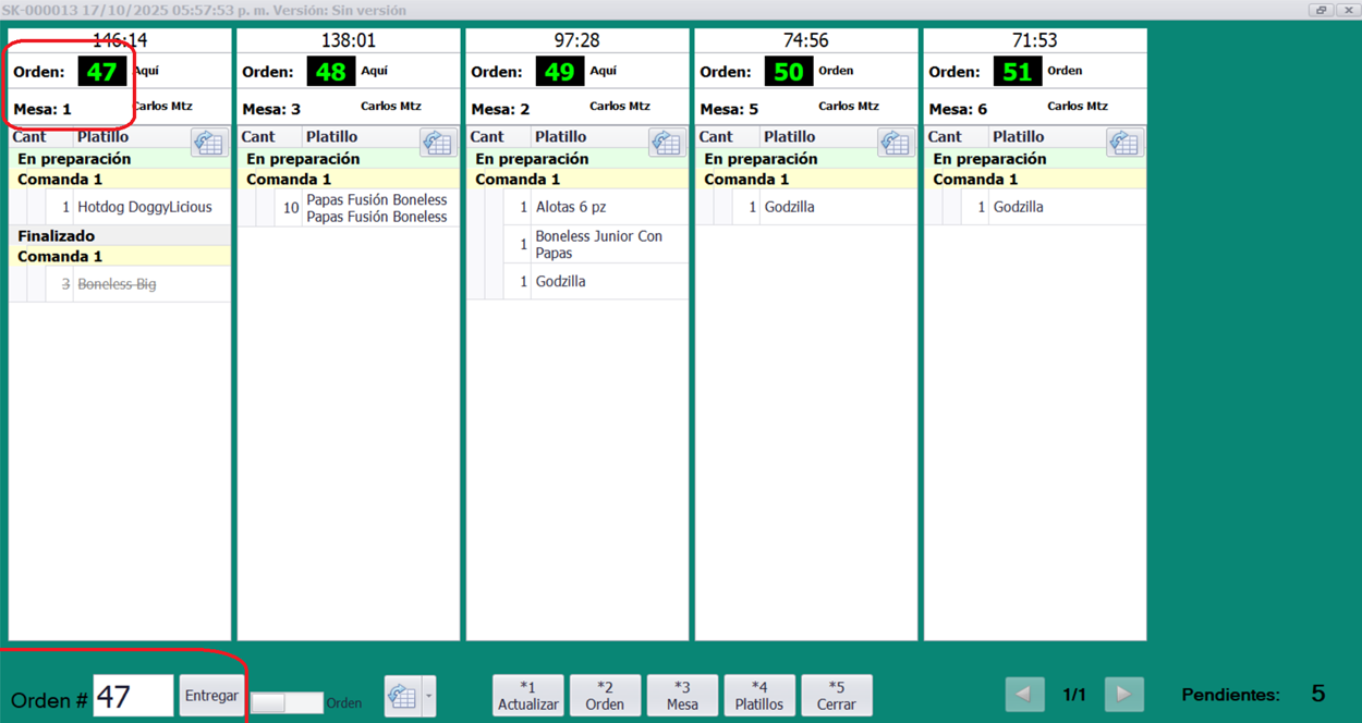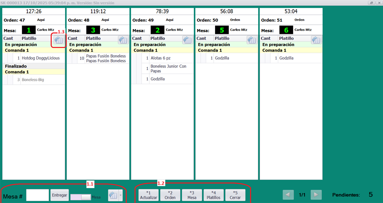 - Los platillos entregados quedan disponibles para consulta en los botones *2 Orden y *3 Mesa, que muestran exclusivamente las últimas 100 ordenes entregadas.