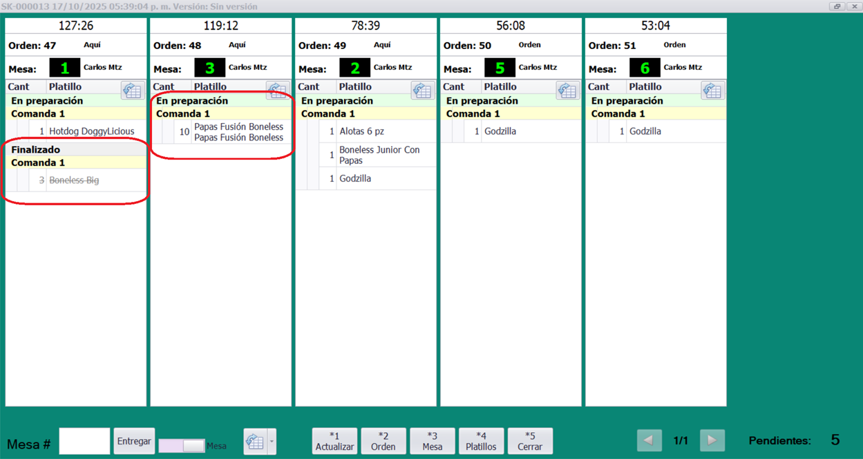 - Actualiza la visualización en las pestañas: el platillo finalizado aparece como tachado en su orden y contribuye al estado de la orden en Finalizado cuando toda la comanda se entregue.
