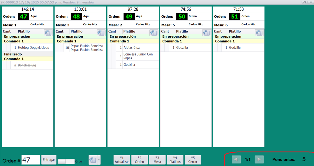 En la parte inferior derecha se encuentran los botones de navegación para moverse entre páginas cuando hay más órdenes que el espacio disponible en pantalla. Se muestra también un contador de pendientes que indica cuántas órdenes faltan por entregar.